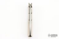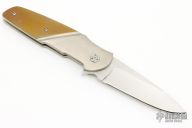 This liner-lock flipper features a hand-rubbed satin finish blade with flipper. The handle has partially anodized titanium scales, stainless steel liners, and an anodized titanium back-spacer.  Sergio's ball bearing system gives the knife an effortless flip that requires no wrist action.  Perfect lockup, detent, and blade seating. Includes certificate from maker, and drawstring bag. The handle has many scratches and scuffs. Blade Steel: RWL 34