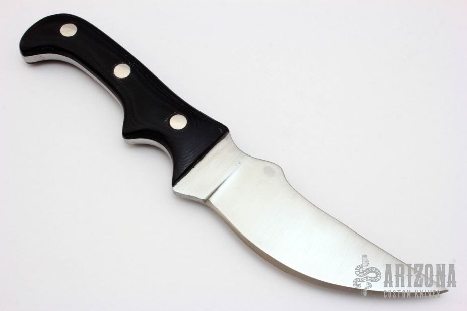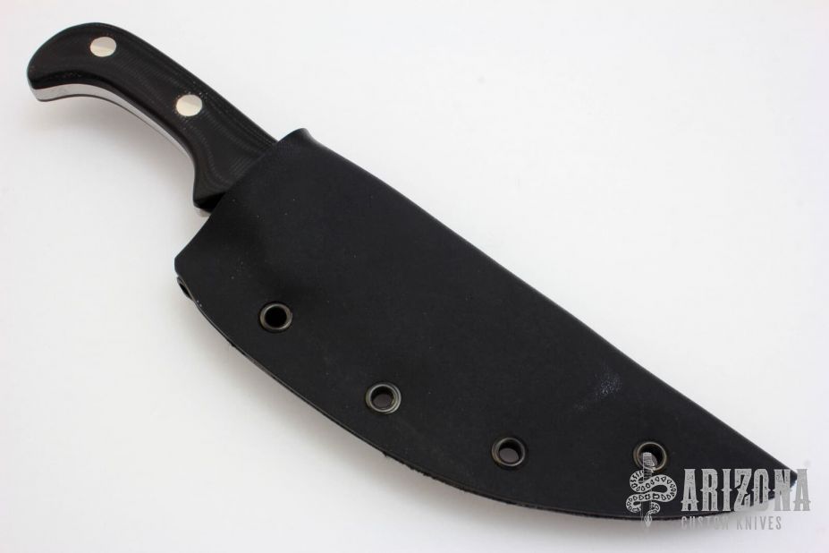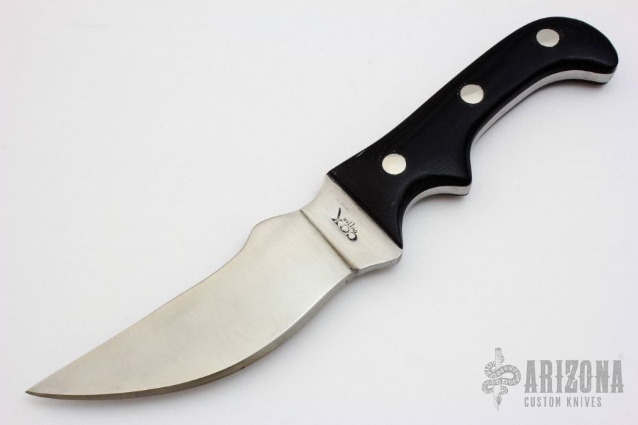This fixed blade from Cox Cutter Knives features an upswept satin finish blade made from 1095 carbon steel. The handle is comprised of black G10 scales with stainless steel pins over full tang construction. Felt lined black kydex sheath included. New from maker. Some kydex marks on blade but otherwise excellent condition.