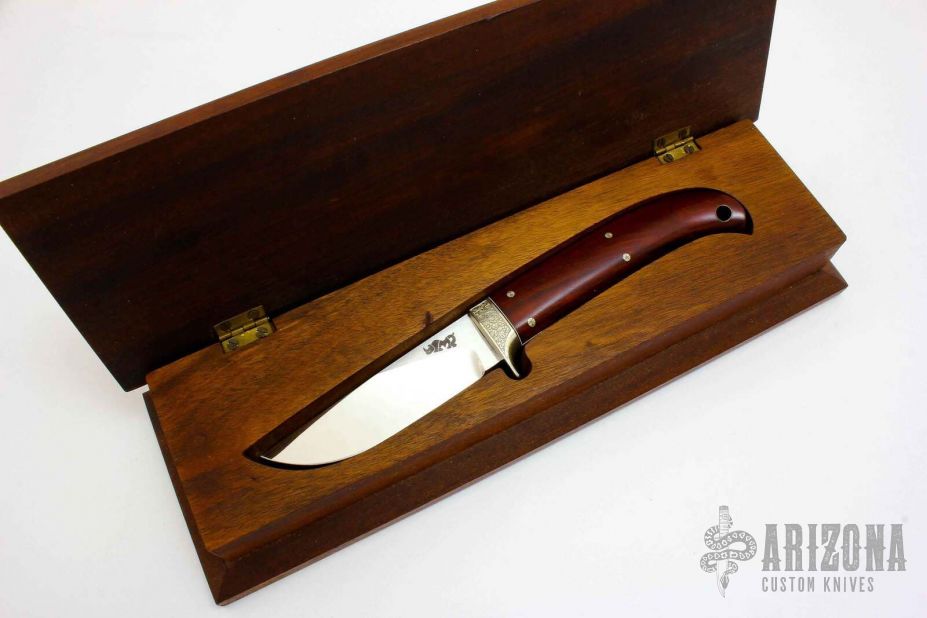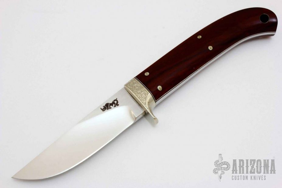 This small fixed blade from Mick Russell features a two tone blade with satin flats and mirror polished grinds. The handle is comprised of engraved nickel silver bolsters and pins with M'tisa wood scales over white and black liners and full tapered tang construction. Lanyard tube in pommel. Includes a Tamboti Wood Presentation Case also made my Mick. Excellent condition. Numbered #034 on ricasso.