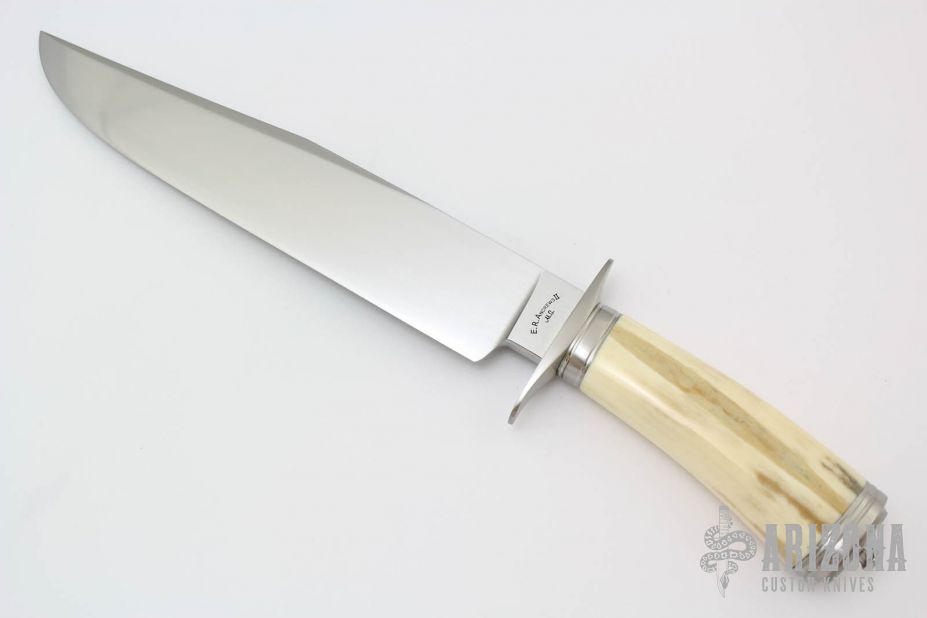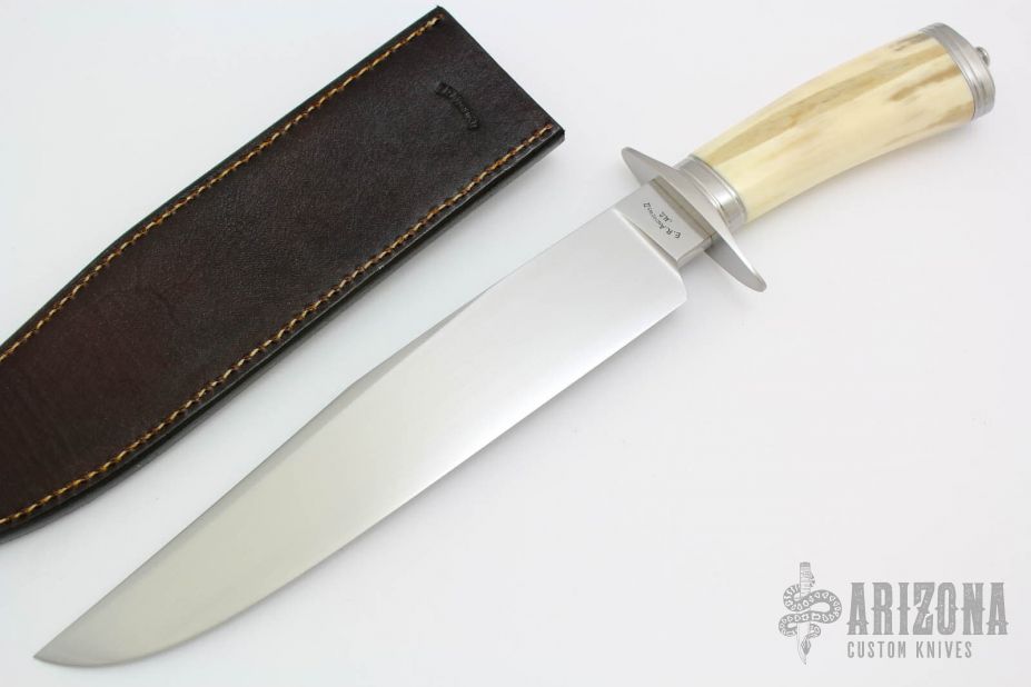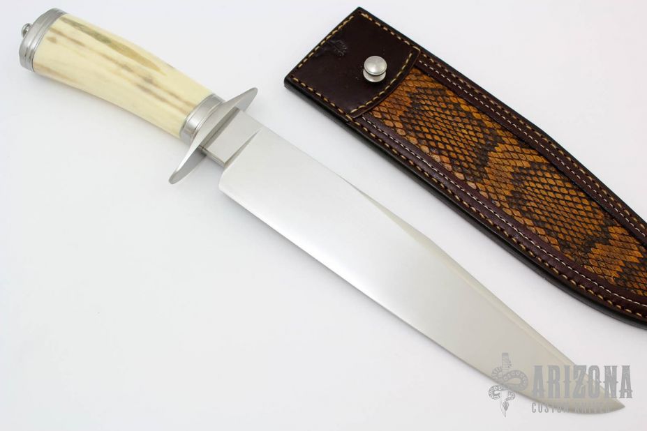 This Hawthorne Bowie by Russ Andrews features a hand rub satin finished blade with false top edge, .263" blade stock, 1.802" blade depth. Hidden tang construction with stainless steel guard, butt and ferrule, has a walrus ivory grip. Includes leather sheath with python skin inlay. Excellent work. Comes with a nylon zippered case and a professional photo. has a very fine crack from the guard to about the middle of the handle, very hard to see, but you can feel it with your finger nail. Excellent condition otherwise. Very beautiful piece. Recently touched up by Russ Andrews.