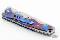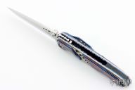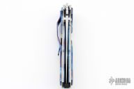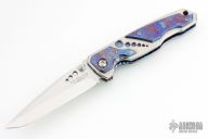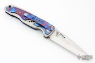 This XF #008 by DC Munroe features a satin finish blade with dual thumbstuds and a fileworked thumbrest. The handle has satin finished titanium scales with anodized titanium overlays, fileworked and anodized titanium liners, carbon fiber backspacer, tip down anodized titanium clip. Nice detent, lockup and blade seating. Excellent condition. B-side of blade says "XF #008.