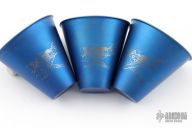 Set of 3 titanium shot glasses by Dmitry Streltsov. Anodized with Airplane theme. New from maker. Includes drawstring pouch.