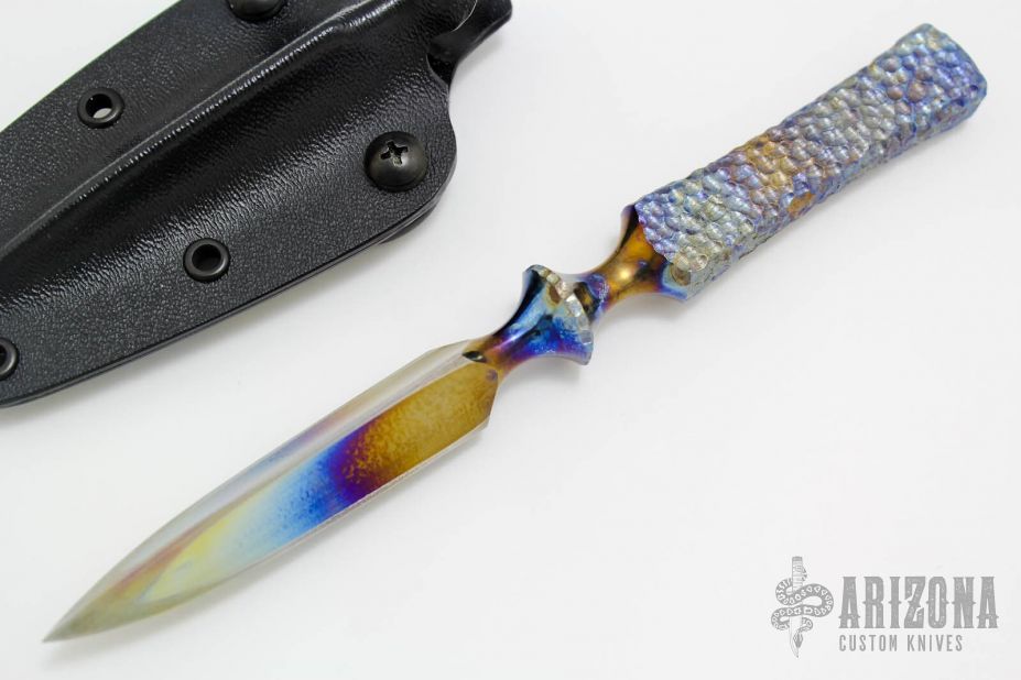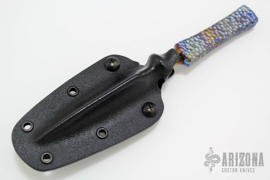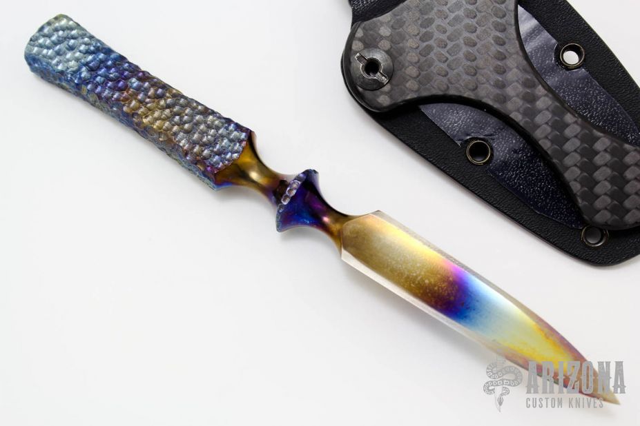 This Mortem ITCU from Special Circumstances features a triple edge, hollow ground dagger style blade. The handle is comprised of integral titanium conostruction with stippling. The Entire piece has been heat colored. Includes kydex sheath with Carbon Fiber belt clip. Excellent condition.