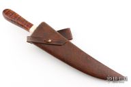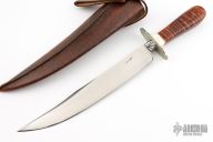 This Bowie by WR Hurt features a mirror satin polished upswept blade with false top edge and visible temper liner (although it probably won't show up in the pictures), .247" blade stock and 1.399" blade depth, hidden tang construction with integral fileworked guard. The handle has a fileworked nickel silver guard, intricate inlaid silver wire in the curly maple handle with mammoth ivory and nickel silver spacers. Comes with a nylon zippered case. Comes with a brown leather covered wooden sheath with drop loop. Has a crack in the mammoth ivory spacer, otherwise excellent condition.