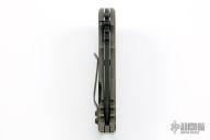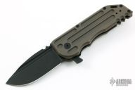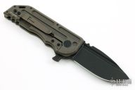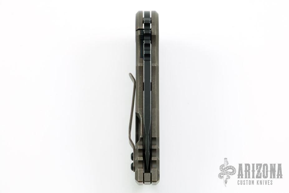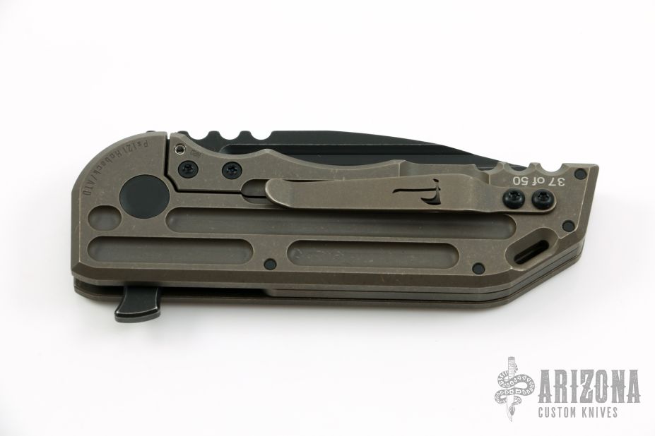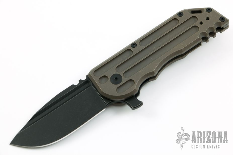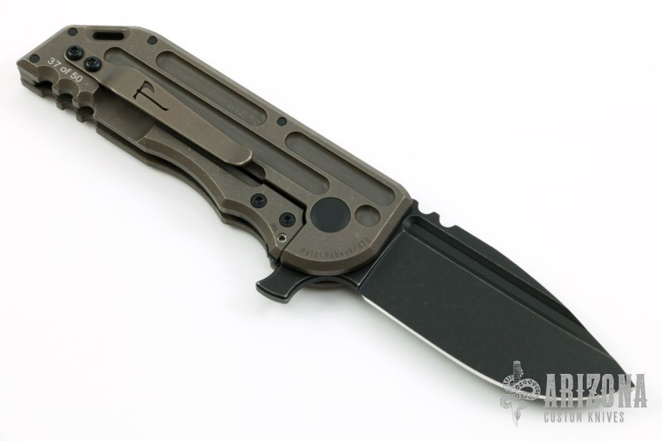This WarSpear is a collaboration between Jake Hoback Knives and Alphahunter Tactical Design. It features a black fallout finished blade with fullers, notched thumbrest and flipper. The handle is comprised of a tumbled and bronzed titanium frame over a matching titanium floating backspacer, tip up clip and lanyard hole in pommel. Includes allen key set, maker's card, Hoback Knives original box. Excellent condition. S/N 37. This was a run of 50.