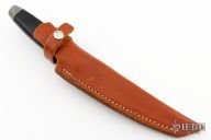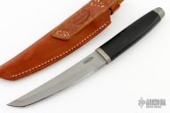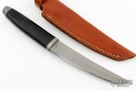 This Yoroi Doshi by Vaughn Neeley of Timberline Knives features a bead blasted blade with .250" blade stock and 1.052" blade depth, hidden tang construction. The handle has a bead blasted stainless steel guard and a bead blasted stainless steel butt with a black linen micarta grip. Has some light scuffs/scratches, otherwise good condition. "032TD" on back of blade. Comes with a brown leather sheath.