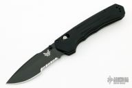 The 407SBK Vallation is equipped with a partially serrated, black finished CPM-S30V stainless steel blade and a black aluminum handle. Benchmade's Vallation folder is an EDC duty knife with snappy AXIS® Assist action and a fully ambidextrous build. The Vallation takes its styling cues from their legacy line of automatic knives with a tactical, ergonomic profile. A unique mohawk spine allows excellent blade control without aggressive jimping. The handle comes outfitted with a carbide tipped glass breaker and a reversible deep-carry pocket clip. Features: Premium S30V blade with mohawk spine for added control. Contoured handle with a textured palm swell provides a secure grip. AXIS® Assist mechanism offers quick and effortless blade deployment. Comes with original box and papers. Excellent condition.