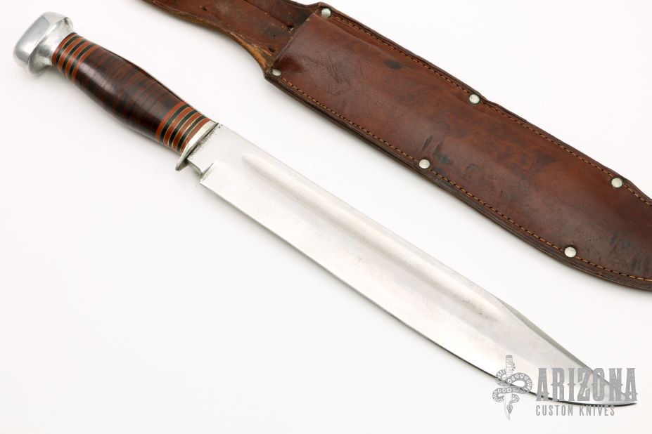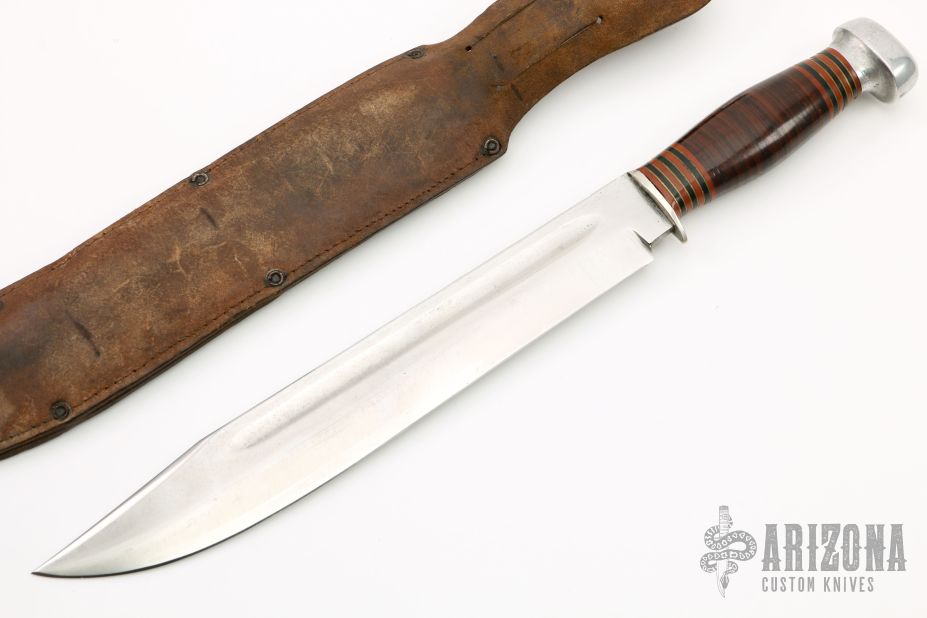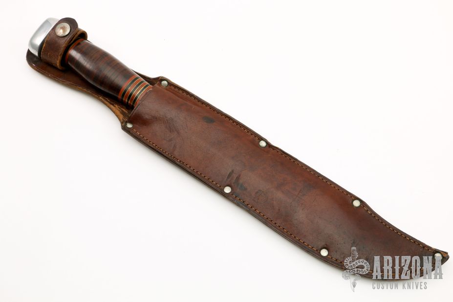 This Trail Maker by Marbles features a clip point satin finished blade with fullers and notched thumbrest, .221" blade stock and 1.515" blade depth, hidden tang construction. The handle has a nickel silver guard, aluminum butt, stacked leather grip and black/red/brass spacer pattern. Comes with original brown leather sheath, but the blade has cut it at the bottom of the sheath and the blade can stick out. Needs to be restitched. Has some scratches and patina, otherwise good condition for its age. There are no markings on this knife.