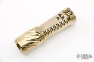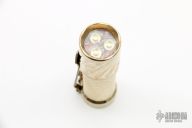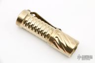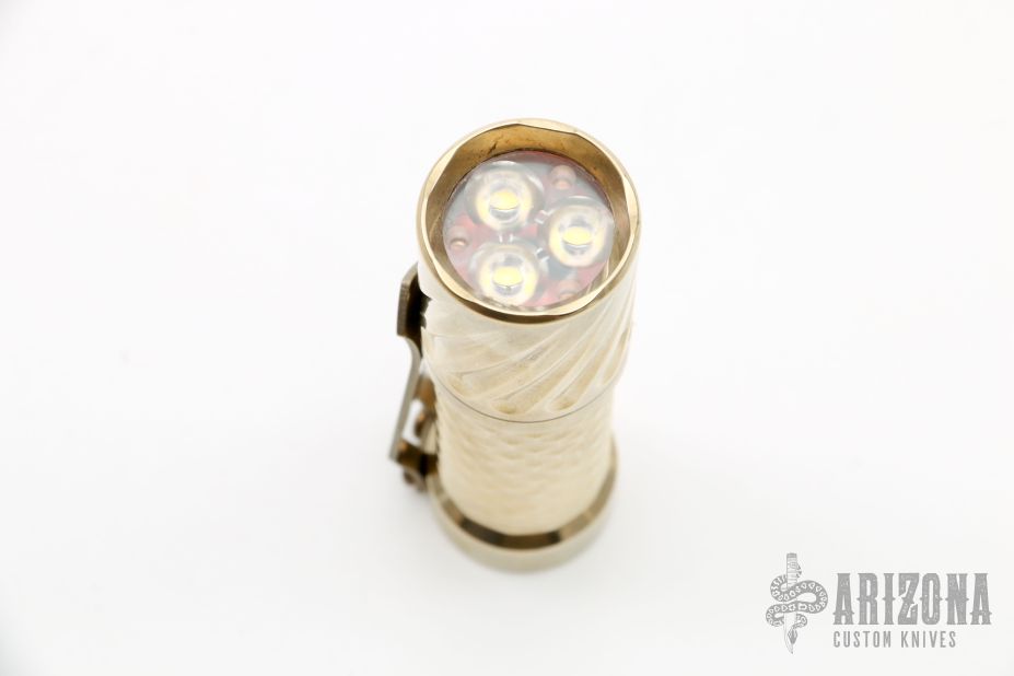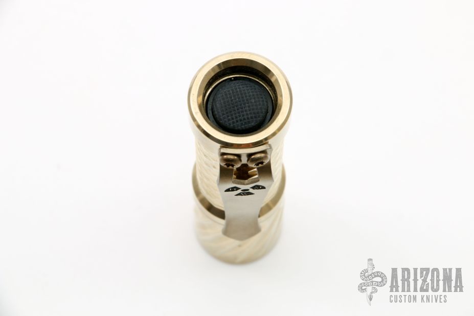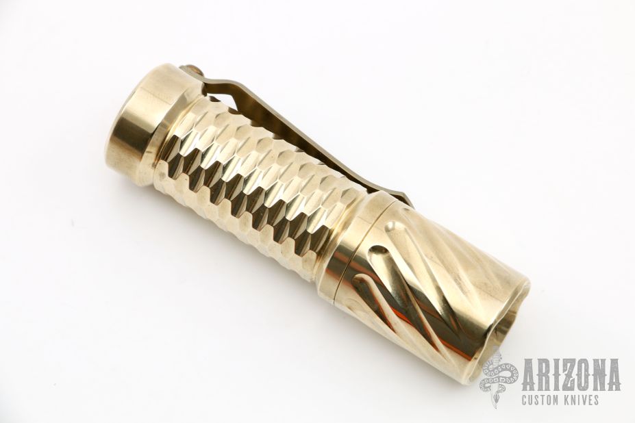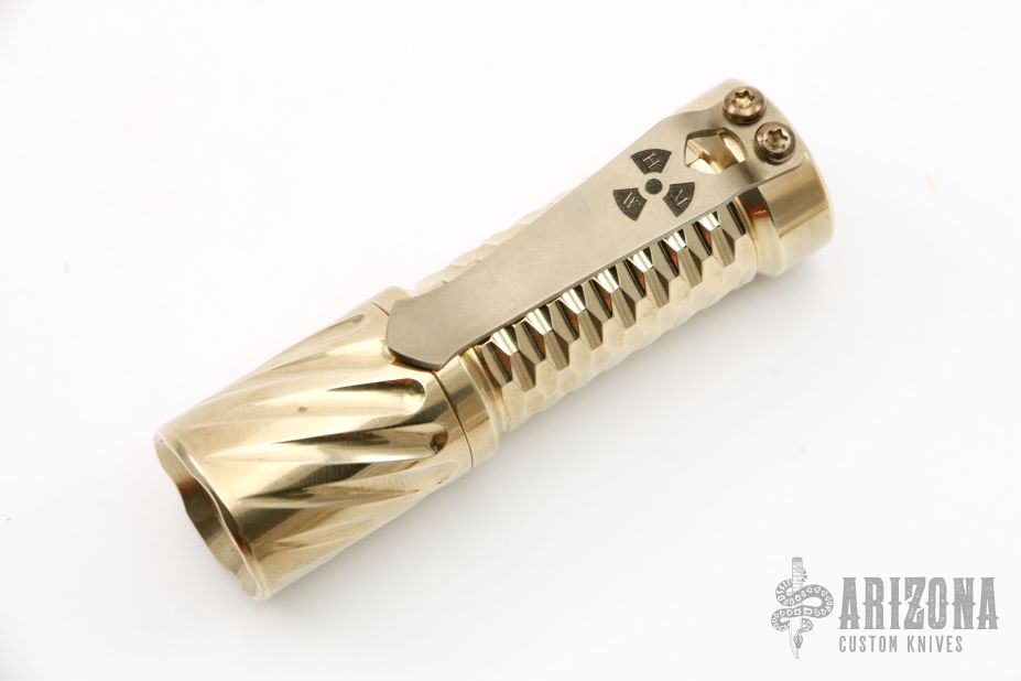 This Twist/Gunner Grip Trident by Hanko Machine Works is made from Aluminum Bronze, it is high polished, has a tip up Steel Flame titanium clip. Components: Nichia 219C High CRI (90+) 4000K. Excellent condition. Comes with hard case.