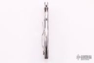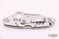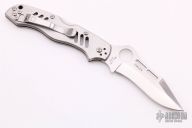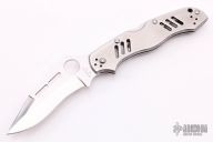 The concept of the Adventura folder came from Romanian Technical Manager Alexandru Diaconescu. In keeping with his methodological background, the folder is techie, futuristic and fastidiously engineered to combine function with a cool factor. The PlainEdge VG-10 blade is hollow-ground with an unsharpened swedge-grind. Oblong slots cut through the blade and handle diminish weight and allow a glimpse of the knife's internal components and locking mechanism. The fully stainless handle is a composition of swells and angles inviting your hand to wrap around and grip in comfort. Both the back-lock and Spyderco Round Hole are positioned to facilitate easy single hand deployment and jimping on the blade's crown keeps your thumb in controlled contact. For added lock safety, a David Boye Dent is carved from the locking lever and eliminates accidentally releasing the lock if gripping the folder tightly. A four-way: left/right, tip-up/tip-down pocket clip attaches via three steel screws and has a rounded, tapered end that stops wear and tear on a pant's pocket. Excellent Condition. Comes with original box.