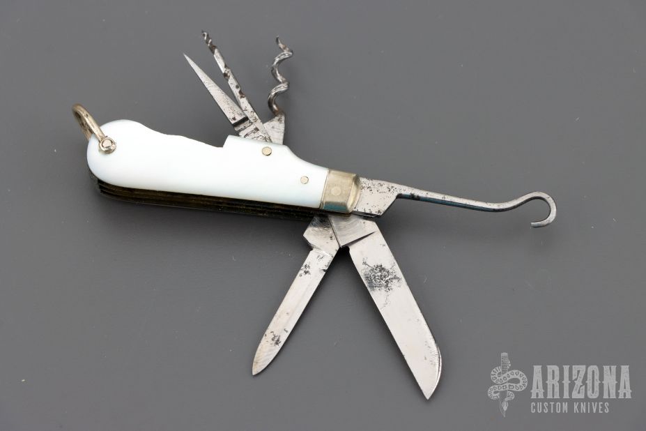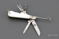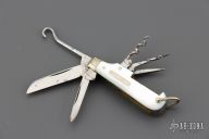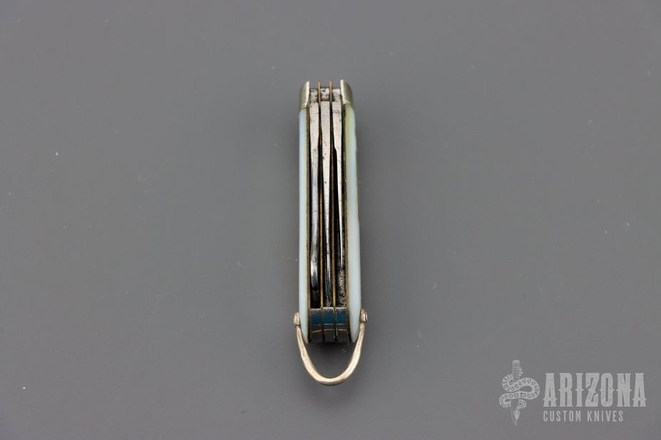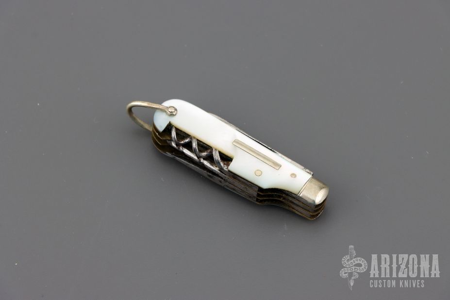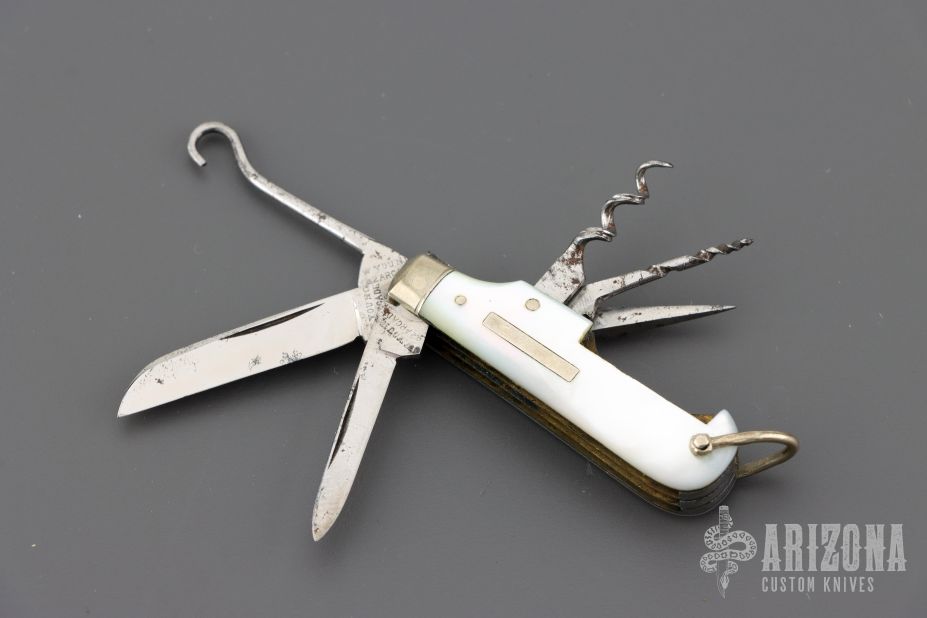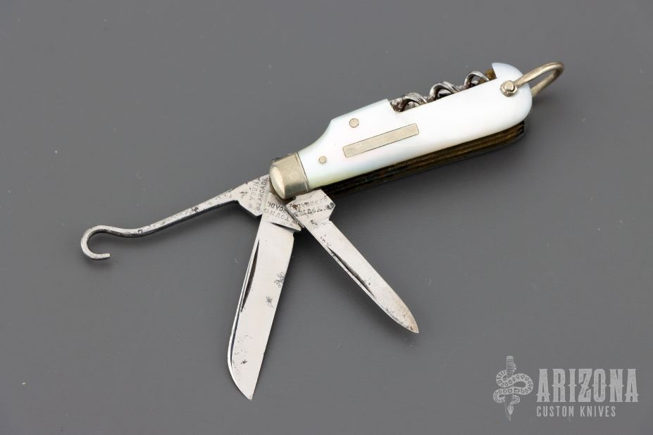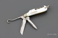 This miniature slipjoint by W. Young features mirror finished blades with nail nicks, has a pen blade, wharncliffe blade, hook, corkscrew, square punch, drill. The handle has nickel silver bolsters and escutcheon, mother-of-pearl covers, and brass liners and steel springs. Has some scratches and oxidation, otherwise good condition for its age. I can't really find any info on the maker because there is a song titled "Young Knives", so if you know something about "W. Young 32 Arcade", which is what is stamped on the blades, please let us know. Cool little piece.