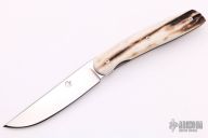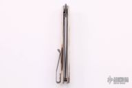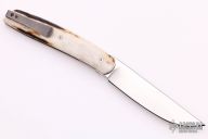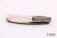 This Front Flipper by Brad Zinker features a hand rub satin finished blade that is nearly mirror polished, notched thumbrest and front flipper. The handle has beautiful stag scales, tumbled titanium liners and tip up clip. Rides on bearings, nice detent, lockup and blade seating. Comes with a zippered case. New from maker.