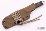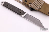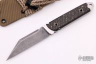 This knife by Apeiron Bladeworks features an acid stonewashed blade with notched thumbrest .194" blade stock and .871" blade depth, full tang construction. The handle has brass infused carbon fiber scales and a lanyard hole at the butt. Comes with a carbon fiber pattern tan Kydex sheath and COA dated January 2020. Excellent condition. Comes with a zippered case.