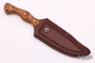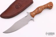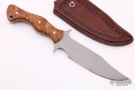 This "On Your Six" fighter with bead blast finished blade and integral double guard, full tang construction, .196" blade stock and 1.462" blade depth. Scales are birdseye maple burl wood with nickel silver pins and a lanyard hole. The handle is fileworked and filled with black epoxy with brass filings. Comes with a hand tooled brown leather sheath with belt stud made by O'Machearley's Leather. New from maker.