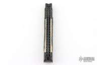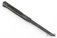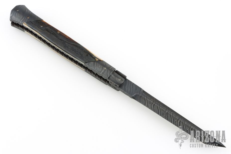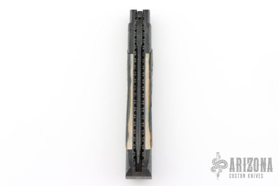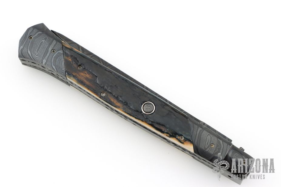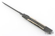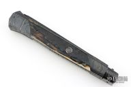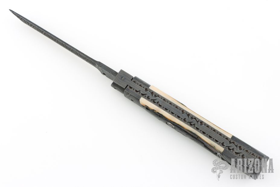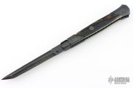 This Picklock by Burn Knives features a Damascus tanto blade with false top edge, .192" stock. The handle has Damascus bolsters, front and rear, bark mammoth ivory scales, Damascus button, fileworked Damascus backspacer and fileworked liners. Excellent condition. Nice lockup and action. Comes with a zippered case and makers card. This knife was purchased from the makers personal collection, it was one of his favorites he had ever built. Has the finest set of black mammoth ivory you will ever see!