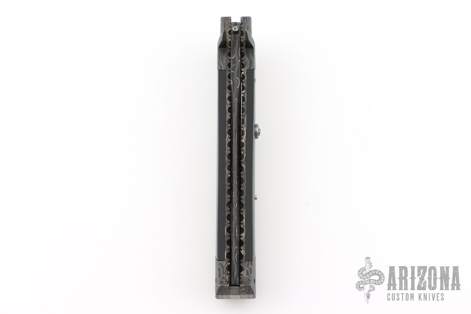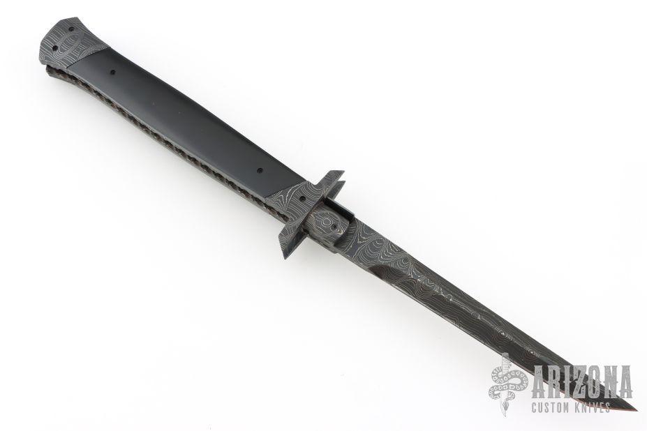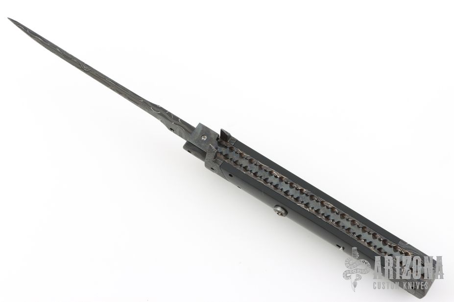 This Picklock by Burn Knives features a Damascus tanto blade with false top edge, .194" stock. The handle has Damascus bolsters, front and rear, cultured black onyx scales, Damascus button with silver skull, fileworked blued steel backspacer, fileworked Damascus liners. Has safety. Excellent condition. Nice lockup and action. Comes with a zippered case and makers card.