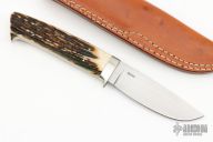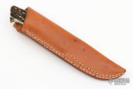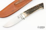 This knife by Tom Mayo features a hand rub satin finished drop point blade, .155" blade stock and 1.120" blade depth, full tang construction. The handle has a nickel silver guard and stag scales. Comes with a brown leather sheath and a leather zippered case. Has some light scratches on the guard, otherwise excellent condition. Dated 2002 on the blade.