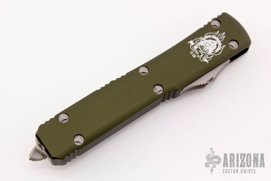 This USN G9 Ultratech Hellhound Straight Razor by Microtech Knives features an apocalyptic finished blade with notched thumbrest. The handle is green aluminum with blasted hardware and a tip down apocalyptic finished stainless steel clip. Serial number 201. Dated 09/2017. From the 2017 USN Gathering. Comes with original box and papers.