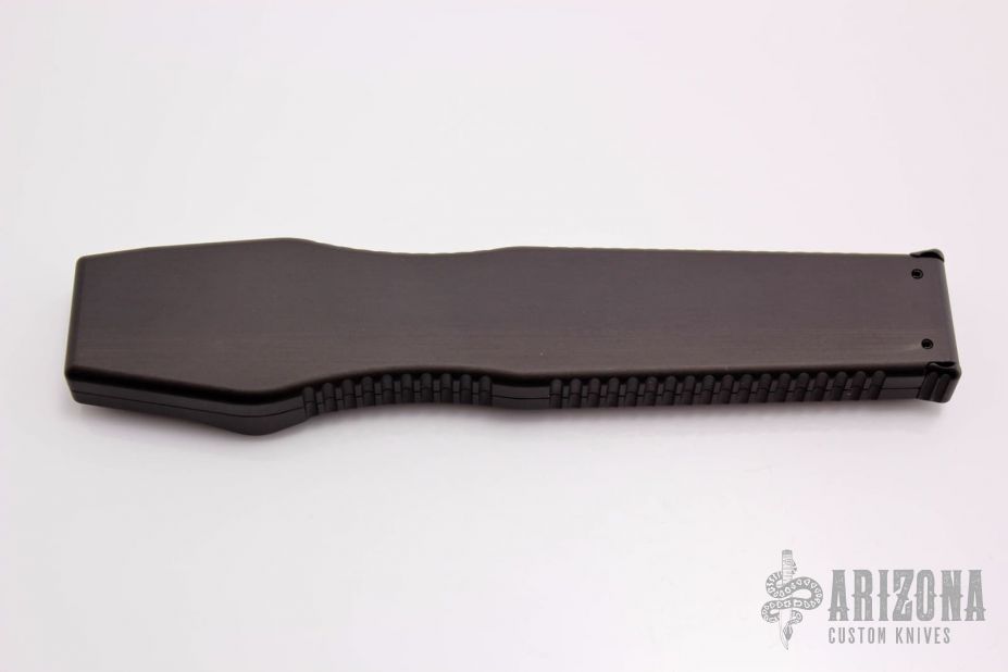 HALO II - the clip point blade model in the HALO series by Microtech Knives. Single action, side positioned button for firing. Closure via a reverse charging handle in the rear of the frame. Contoured frame grip with milled ribbing on the frame spine and belly. This Halo II has a black DLC partially serrated blade and black aluminum frame with all black hardware. Dated 09/2002 and S/N 023. Knife includes nylon sheath. Excellent condition; a few very light scuffs on the frame.
