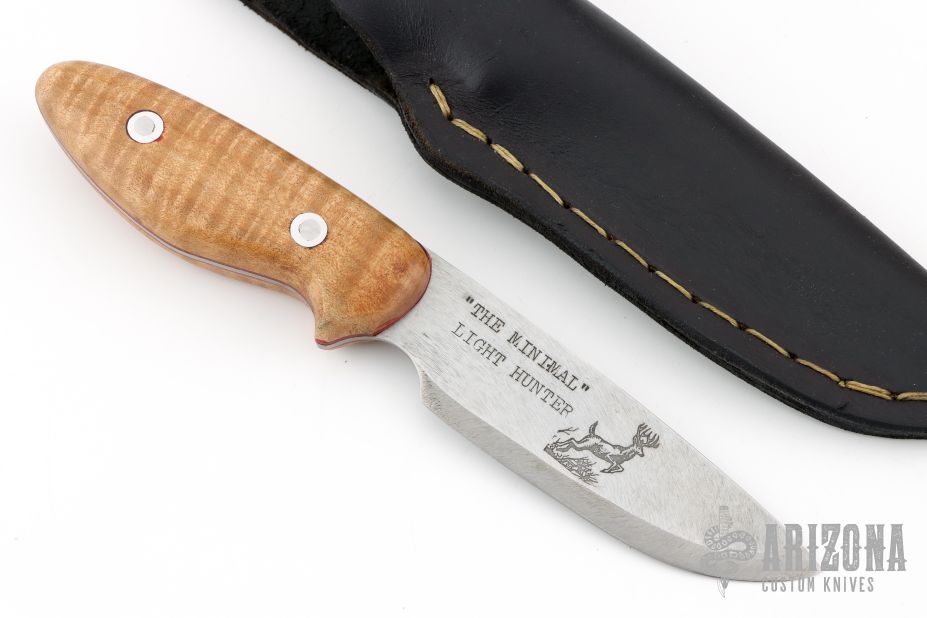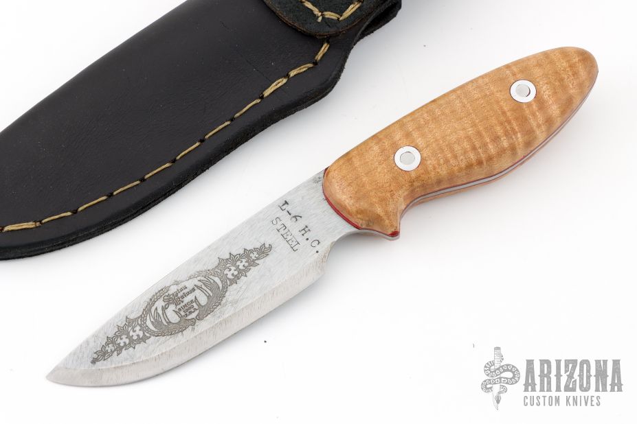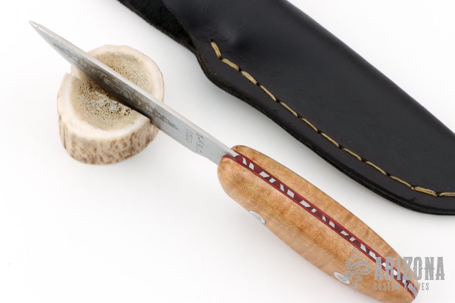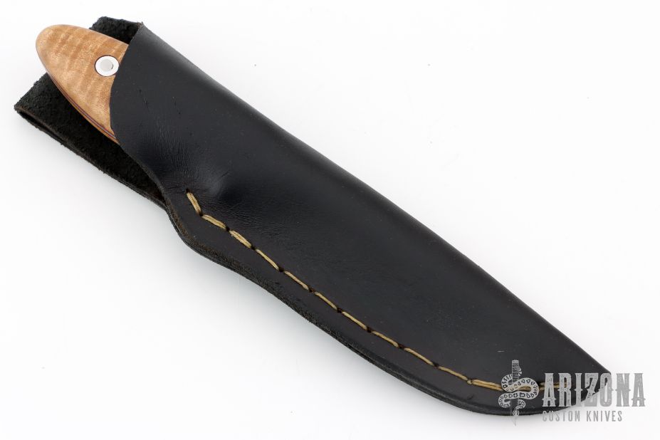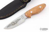 This Light Hunter by Joseph Sexton features a satin finished blade with .077" blade stock and 1.128" blade depth, full tang construction with fileworked tang. The handle has fiddleback maple scales with red liners. comes with a black leather sheath. New from maker.