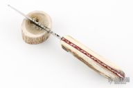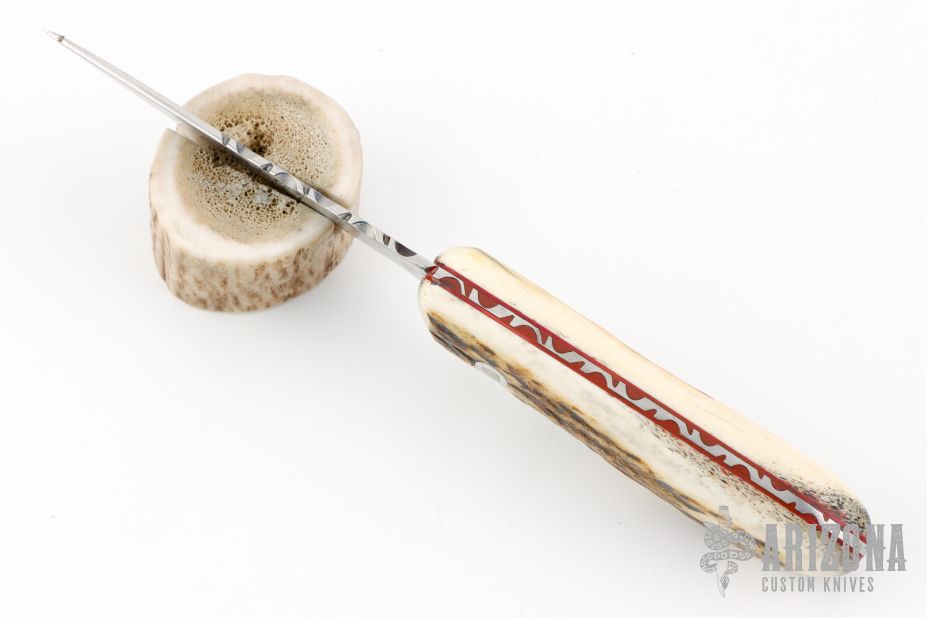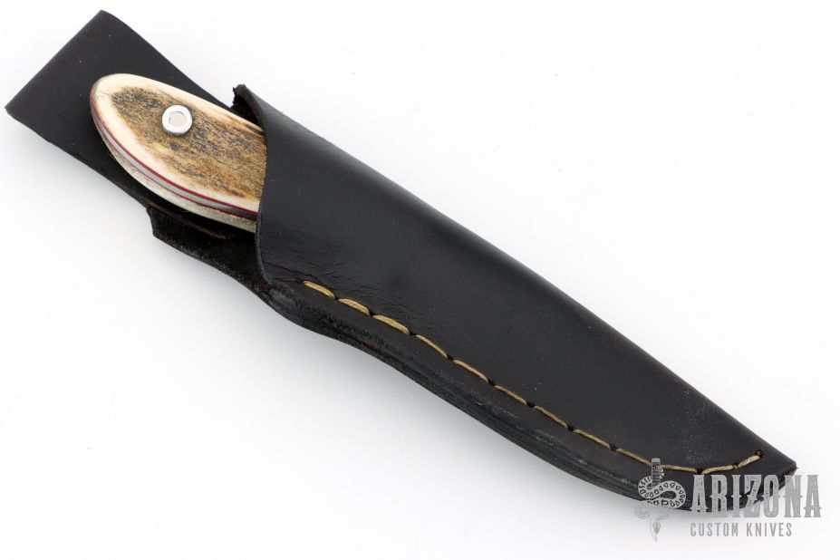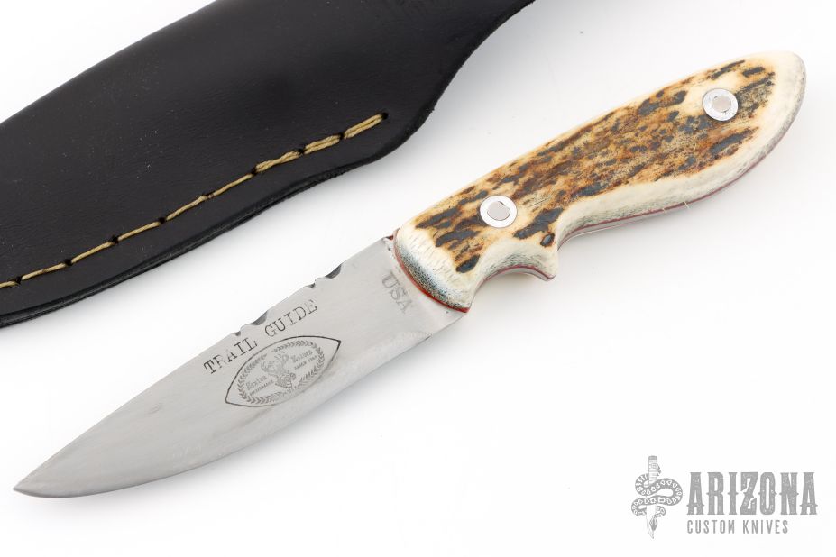 This Trail Guide by Joseph Sexton features a satin finished drop point blade with fileworked thumbrest, .092" blade stock and .970" blade depth, full tang construction with fileworked tang. The handle has stag scales with red liners. Comes with black leather sheath. New from maker.