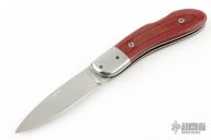 This Lockback Folder by Truncali Custom Knives features a satin finished drop point blade with nail nick. The handle is comprised of stainless steel bolsters and red micarta scales over steel liners and backspacer/lockbar. Includes maker's card and padded/zippered case. New from maker.
