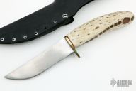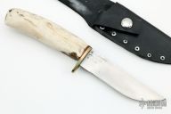 This hunter by Larry B Arnold features a satin finished clip point blade, .092" blade stock and 1.111" blade depth, hidden tang construction. The handle has a brass guard and a jaw bone grip. Comes with black leather sheath. Has a stabilized handle. New from maker.