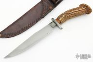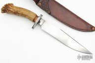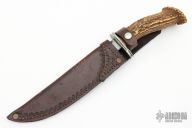 This knife by James Blauvelt features a hand rub satin finished blade with visible temper line and false top edge, .176" blade stock and 1.379" blade depth, hidden tang construction. The handle has a fluted steel guard, crown stag grip and a fluted copper spacer. Comes with hand tooled brown leather sheath. Has some scratches, otherwise good condition.