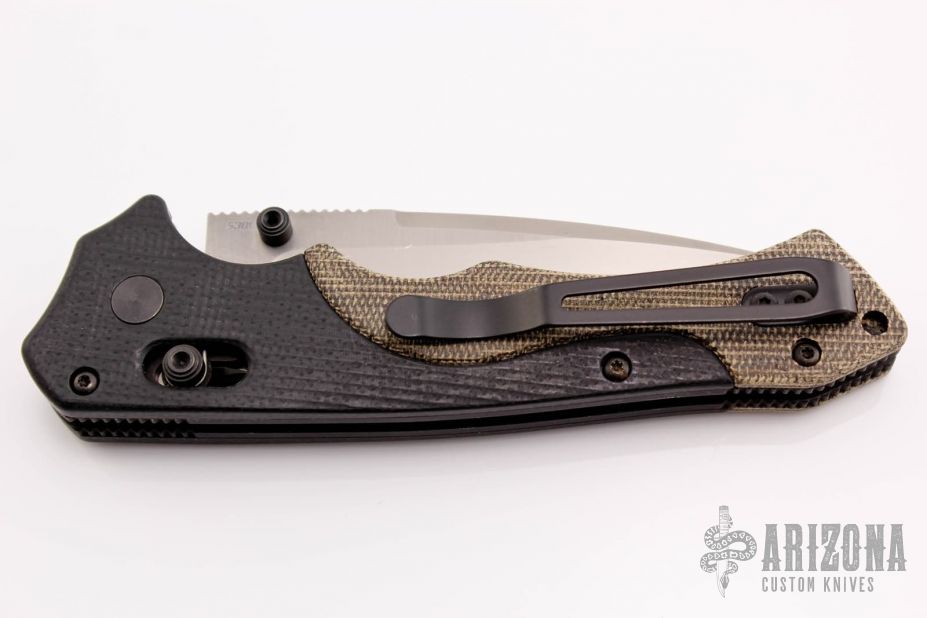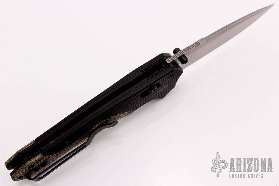 This 615 Mini-Rukus is a Neil Blackwood design executed by Benchmade. It features a drop point blade with swedge, dual thumb studs and notched thumb rest. The handle is comprised of black G10 bolsters and brown micarta scales over black coated steel liners and barrel spacers. the black coated deep carry clip is reversible for left or right hand, tip up carry. Includes original drawstring pouch, paperwork and box. Some marks in blade finish but overall great condition.
