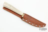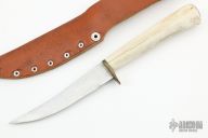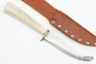 This hunter by Larry B Arnold features a satin finished carbon steel blade with .085" blade stock and .814" blade depth, hidden tang construction. The handle has a brass guard and bone grip. Comes with a brown leather sheath. New from maker.