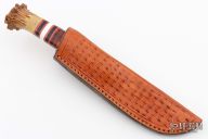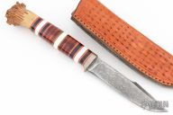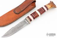 This Scagel style Hunter by WD Pease features a Damascus clip point blade with a false top edge, .164" blade stock and 1" blade depth, hidden tang construction. The handle has a mokume guard, red/brass/wood/mammoth ivory/leather spacer pattern, crown stag but with a single brass pin. Comes with a hand tooled brown leather sheath. Excellent condition.