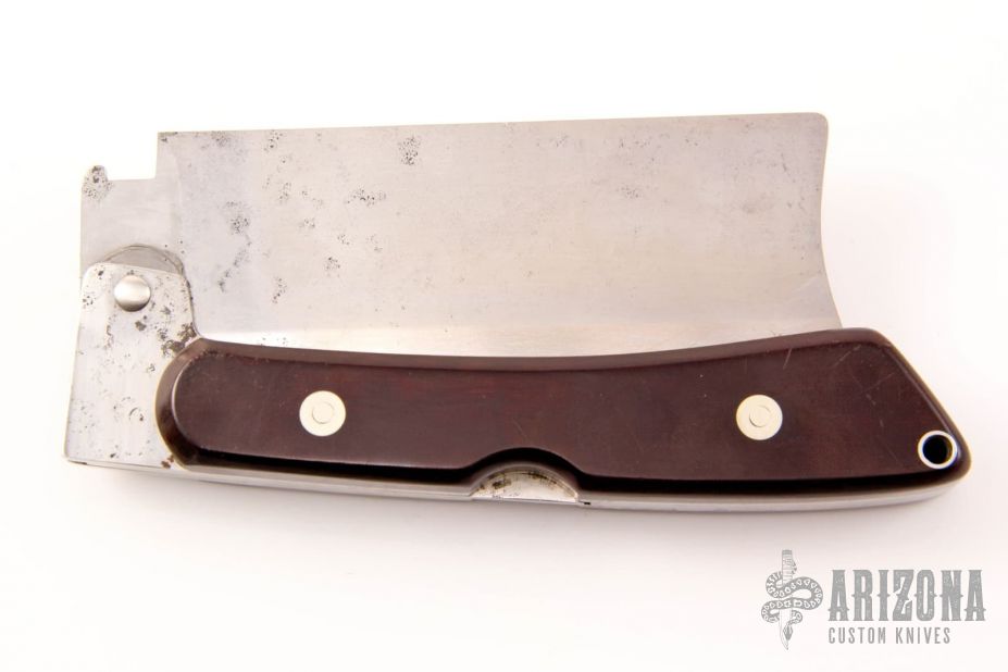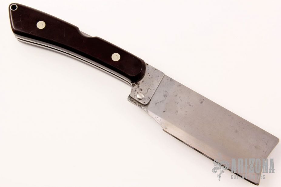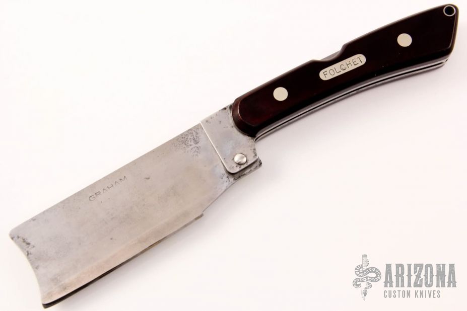 This vintage Folchet (folding hatchet) by Graham Knives features a satin finished hatchet style blade. The handle has a steel frame with maroon linen micarta scales, nickel silver pins and escutcheon. Nice strong lockup. Has some light oxidation on the blade and frame and some light scratches, otherwise good condition. 4.5" blade 11" overall, 6.5" closed.