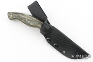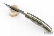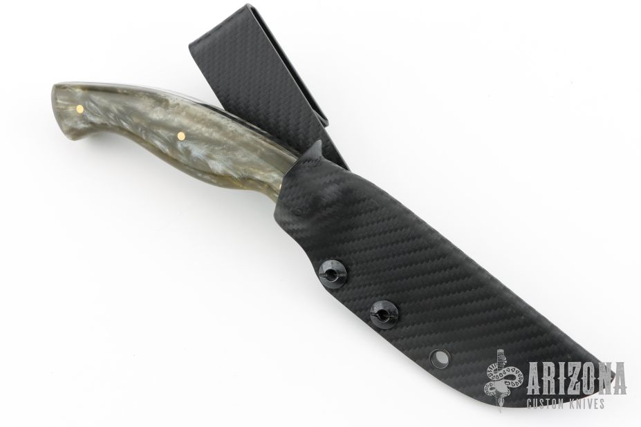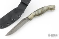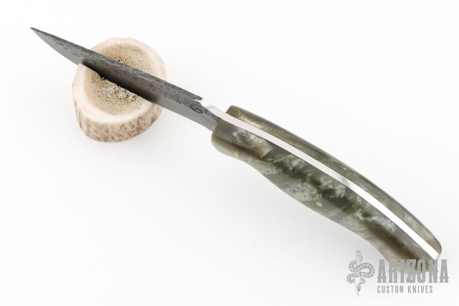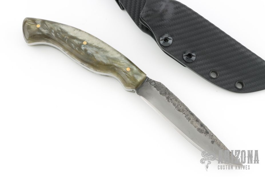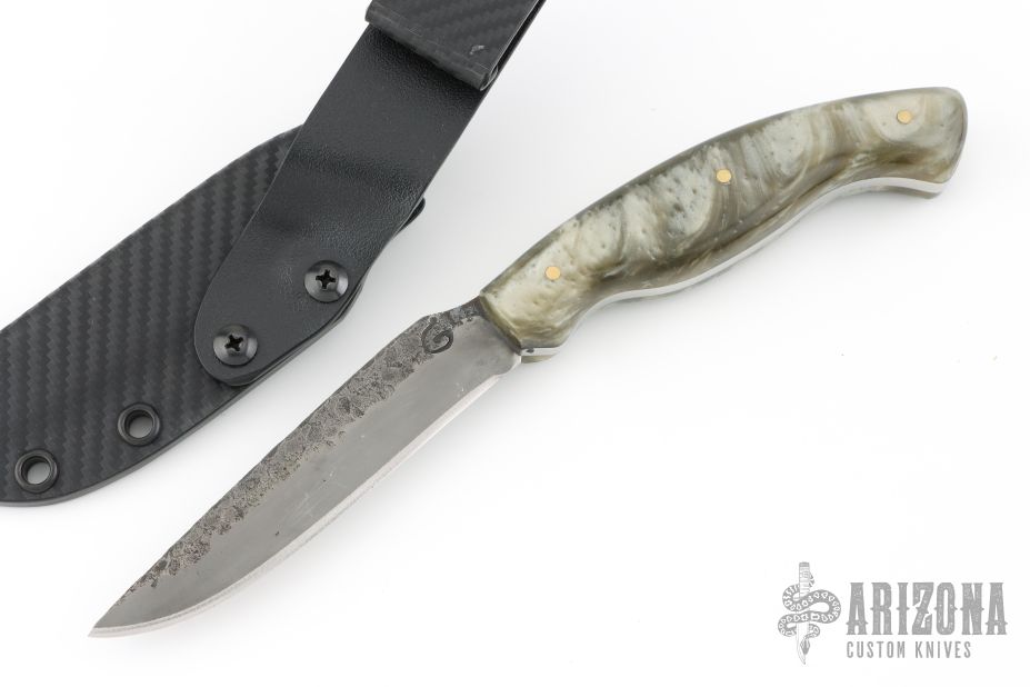 This hunter by Shane Gallagher features a hand forged blade with satin grinds and hammered flats, .146" blade stock and .855" blade depth, full tang construction. The handle has silver acrylic scales with brass pins. Comes with a kydex sheath with belt clip. New from maker. 4" blade 9" overall.