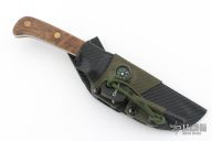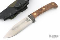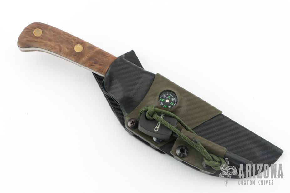 This hunter by Shane Gallagher of Squirrely's knives features a clip point blade with a visible temper line, .160" blade stock and 1.353" blade depth, full tang construction. The handle has carbon fiber bolsters, Australian burl scales with brass pins. Comes with a custom kydex sheath with fire steel and compass. New from maker.