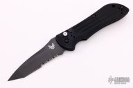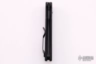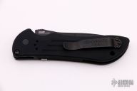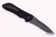 The Model 9100 Auto Stryker is the automatic version of Benchmade's Designer Series Stryker. Designed by Allen Elishewitz, the AutoStryker features a 3.5" 154CM drop point Tanto blade. The handle is made from 6061 T6 aircraft aluminum, hard anodized black for durability. This knife is designed for people who like the features of the Tanto blade shape, but do not want a chisel ground blade; the knife has a double bevel and is symmetrically ground. This one has a partially serrated black coated blade. Good strong action. Black tip up carry clip. Excellent condition. Comes with original box and papers.