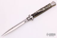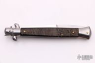 This Swivel Bolster Auto has a stainless steel spear point blade. The handle is composed of a steel front and rear bolsters, brass liners all complemented by sheep horn scales. Excellent Condition.