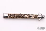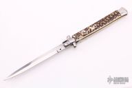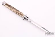 This Swivel Bolster Auto has a stainless steel spear point blade. The handle is composed of a steel front and rear bolsters, brass liners all complemented by stag scales. Excellent Condition.