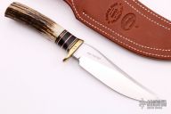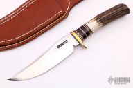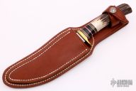 The Model 27 is an ideal all-around heavy-duty sportsman's knife. This knife has a carbon steel blade, .218" blade stock and 1.364" blade depth, hidden tang construction. The handle has a brass guard, and stag grip with black, brass, red, white, black micarta, and duralumin spacers. Randall Knife Society medallion in pommel. Marked RKS 519/343on "B" side of blade. Includes zippered case. Excellent condition. Comes with brown leather sheath marked "Randall Knife Society" on the back.