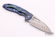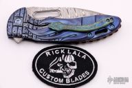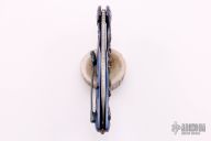 This Sentry XL framework flipper by Korth Cutlery features a Damasteel blade with thumbhole, notched thumbrest and flipper. The handle features an anodized and hand carved titanium frame by Rudy Lala, notched copper backspacer, tip up zircuti clip. Includes IKBS (Ikoma-Korth Bearing System) for smooth and fast opening that requires no wrist action. Nice blade seating, detent, and lockup. Outstanding work with great attention to detail. Includes a zippered case. Excellent Condition.
