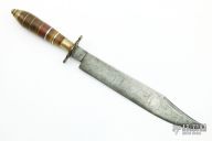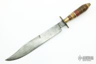 This Bowie knife was made in Mexico in the early 1900s. The blade appears to be forged from a file, you can see some of the file marks on the ricasso, has a false top edge with asymmetrical swedges, .251" blade stock and 1.364" blade depth, hidden tang. The handle has a brass guard, collar and butt, a grip consisting of horn/brass/aluminum/red spacers. The fit and finish is a little rough, but otherwise good condition for its age.