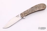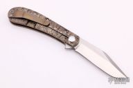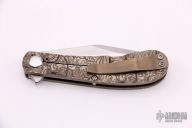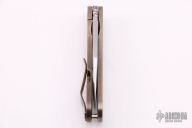 This Backpocket Flipper by Doc Shiffer features a satin finished blade with flipper and fileworked thumbrest. The handle has a laser engraved and anodized titanium frame with and anodized titanium tip up clip. Rides on bearings, nice detent, lockup and blade seating. Comes with a hard case and COA dated 8-7-20. New from maker.