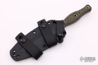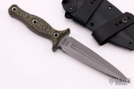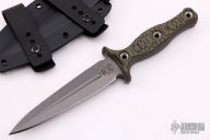 This Raider Dagger by RMJ Tactical features a sniper grey cerakoted double-edged blade with fullers, .215" blade stock and 1.152" blade depth, full tang construction. The handle has Dirty Olive G-10 scales with hollow flanged pins, notched on tang of blade. Comes with a kydex sheath with belt loops. Comes with original box and papers. New from maker.