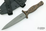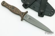 This Raider Dagger by RMJ Tactical features a sniper grey cerakoted double-edged blade with fullers, .215" blade stock and 1.152" blade depth, full tang construction. The handle has Hyena Brown G-10 scales with hollow flanged pins, notched on tang of blade. Comes with a kydex sheath with belt loops. Comes with original box and papers. New from maker.