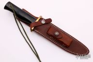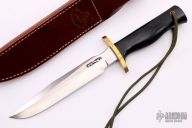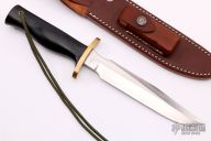 This Model 16 Special Fighter from Randall Made Knives features a satin finish clip point blade with sharpened top edge, .218" blade stock and 1.140" blade depth, full tang construction. The handle is comprised of a forward curved brass double guard and black linen micarta border patrol style handle. Brass lanyard tube with lanyard in pommel. Includes a brown leather sheath with belt loop and a zippered case. Excellent condition.