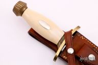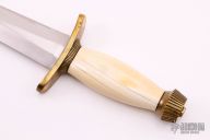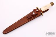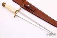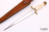 This Model 13-12 Arkansas Toothpick by Randall Made Knives features a satin finished double-edged blade, .199" blade stock and 1.552" blade depth, hidden tang construction. The handle has a brass forward curved guard, brass butt cap, ivory grip with black spacers. The Model 13 is a replica of the historic stiletto-dagger famous in Confederate days. Comes with a brown leather roughback sheath stamped "F.W. Byrd" on the back. Has some light scratches and cracks in the ivory, otherwise good condition.
