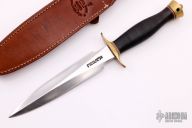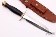 The Model 2-7 by Randall Made Knives is a heavily made dagger or dirk. Brass guard, stacked leather handle, brass butt cap with tang nut and lanyard hole. Double-edged satin finished blade, .210" blade stock and 1.259" blade depth, hidden tang construction. Comes with a brown leather sheath and a zippered case. Has some scratches and patina, good condition otherwise.