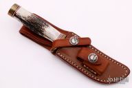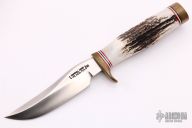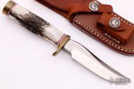 This Miniature Model 3 Hunter by Randall features a stainless steel blade with false top edge, .174" blade stock and .825" blade depth, hidden tang construction. The handle has a brass guard and butt, and stag grip with red/white/blue spacers. This knife is part of a limited edition and is numbered 180. Comes with a brown leather sheath, a letter from Randall and original paper wrapping. Has some patina on the brass, otherwise excellent condition.