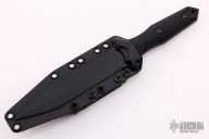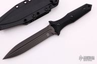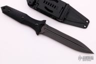 This Grozo by Bastinelli Knives features a double-edged blade with black PVD finish and fullers, .175" blade stock and 1.140" blade depth, full tang construction. The handle has milled black G-10 scales with lanyard hole at the butt. Comes with a kydex sheath with TekLok. Comes with original box. New from Maker!