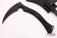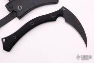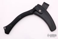 The ReaperTAC from Bastinelli Creations is one cool tool. It's a tactical version of a scythe, an old school tool for reaping crops that has long since been replaced by heavy machinery throughout much of the world. This variation is like a tomahawk in its tactical usage however it incorporates none of its utility functionality. The ReaperTAC measures 9.45" overall with a 6.7" Bohler N690Co stainless steel blade and black Cerakote finish. The recurved shape allows this blade to rip and tear like an elongated talon and the design tapers toward the tip to allow ample penetration power from such a unique tool. The ergonomic handle is made from contoured black G10 allowing a sure grip at the base or top of the handle. The ReaperTAC includes a leather belt sheath and was proudly manufactured by Fox Knives in Italy. Comes with original box and papers. New from maker.
