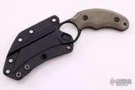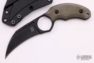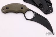 This Harpy by Bastinelli Knives features a black idroglider coated N690 blade with fullers and a false top edge, .145" blade stock and 1.14" blade depth, full tang construction. The handle has green  G-10 scales. Comes with a kydex sheath with belt clip and original box. New from maker!